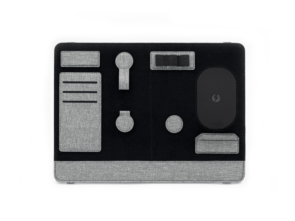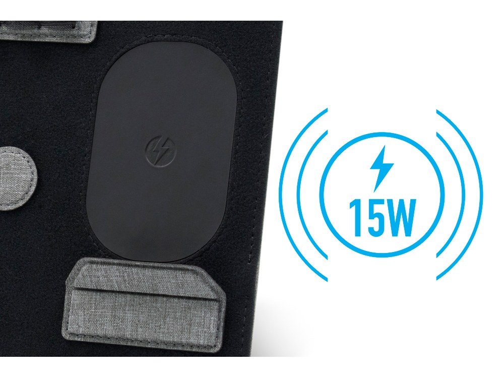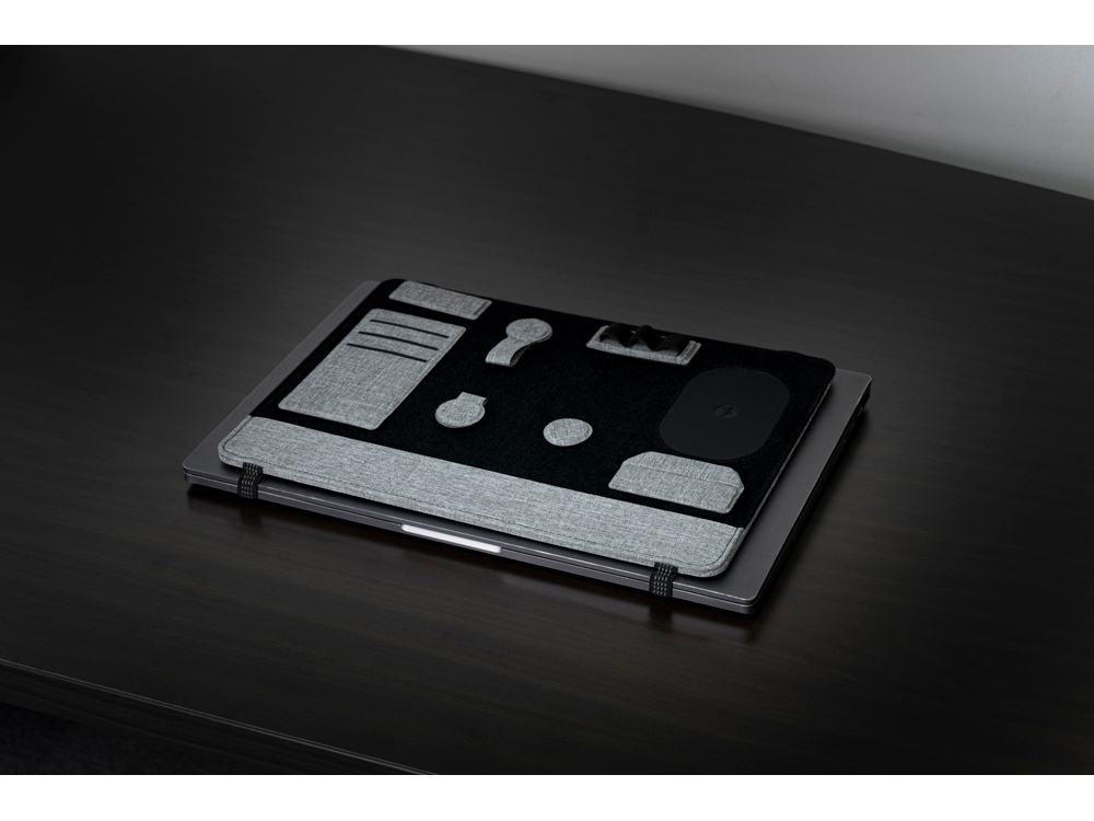 Clipboard Pro, который одновременно служит подставкой для ноутбука и настольным органайзером, является идеальным корпоративным подарком. В Clipboard Pro встроена складная подставка для ноутбука, что позволяет создать эргономичное рабочее пространство в любом месте! Помимо подставки для ноутбука, этот настольный органайзер оснащен подставкой для телефона с быстрой беспроводной зарядкой мощностью 15 Вт (регулируемой), планшетом для обмена, двумя магнитными док-станциями, держателем для ручек, держателем для карт, зажимом для кабеля и подставкой для телефона. Поддерживать порядок на рабочем столе еще никогда не было так просто! Этот универсальный ремень крепится к ноутбуку, как эластичная закладка.